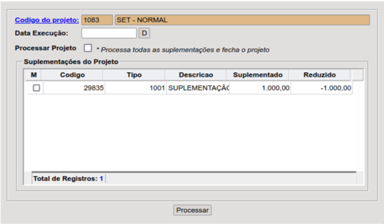 Optando por uma Data Execução, fechando ou deixando em aberto o projeto em "Processar Projeto", que poderá ainda ser utilizado e marcando as linhas que possuem os valores que deverão ser suplementados no "M". Para que a tarefa seja executada deve-se clicar no botão processar.