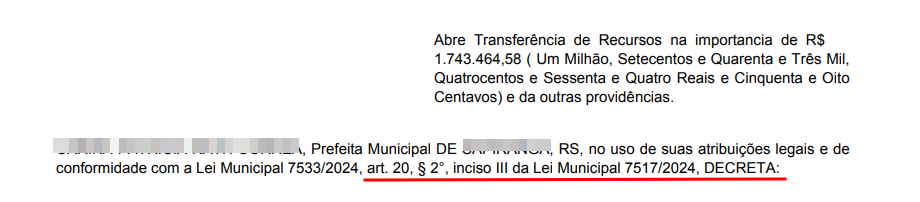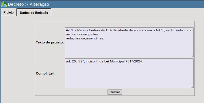 Para a emissão dos Decretos e Projetos de Lei, o usuário deverá tomar como providência o ajuste do texto do 2º artigo, que normalmente dispõe sobre a origem do recurso para a abertura do Crédito Adicional. Tanto para os Decretos como para os Projetos de Lei, o usuário deverá acessar o menu: ORÇAMENTO > PROCEDIMENTOS > SUPLEMENTAÇÕES/REDUÇÕES > DECRETO > ALTERAÇÃO, selecionar o Decreto/Projeto e ajustar o texto na aba “Dados de Emissão” no campo “Texto do Projeto”. Feito isto, a digitação ali gravada será impressa no Decreto ou Projeto de Lei.