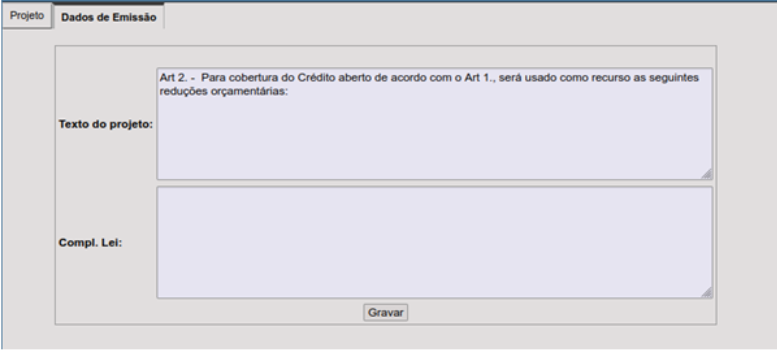 Para a emissão dos Decretos e Projetos de Lei, o usuário deverá tomar como providência o ajuste do texto do 2o artigo, que normalmente dispõe sobre a origem do recurso para a abertura do Crédito Adicional. Tanto para os Decretos como para os Projetos de Lei, o usuário deverá acessar o menu: ORÇAMENTO > PROCEDIMENTOS > SUPLEMENTAÇÕES/REDUÇÕES > DECRETO > ALTERAÇÃO, selecionar o Decreto/Projeto e ajustar o texto na aba “Dados de Emissão” no campo “Texto do Projeto”. Feito isto, a digitação ali gravada será impressa no Decreto ou Projeto de Lei.
