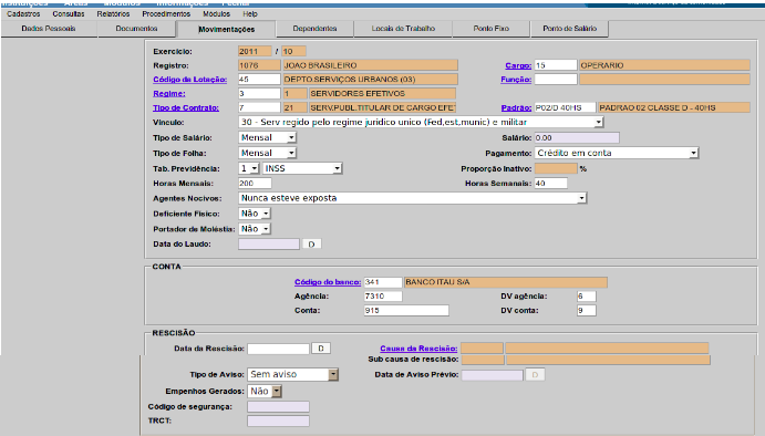Esta aba é destinada para o controle das informações contratuais do servidor que possuem variações durante a vida funcional. O sistema grava estas informações em cada movimento da folha, o que significa, que elas podem diferir em cada um deles e portanto, refletir de maneira diferente nos cálculos efetuados, relatórios emitidos entre outros .