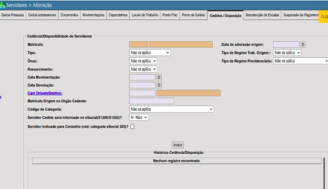 Nesta aba será feito o preenchimento de servidores adidos de outro órgão/empresa para o empregador ou cadastro de informações de servidores cedidos do empregador para outra empresa/órgão.