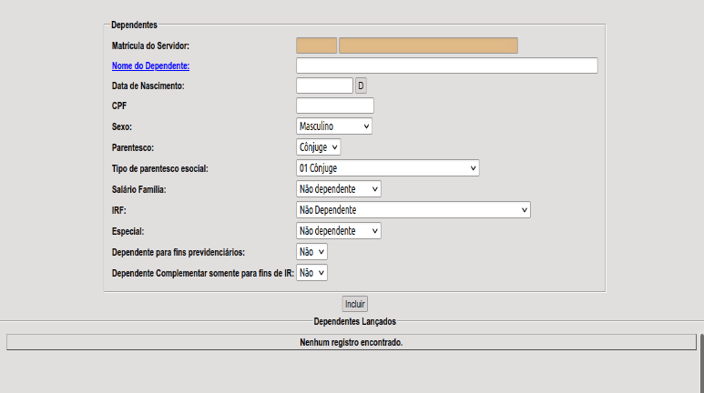Parentesco: Informar o parentesco do dependente com o servidor.