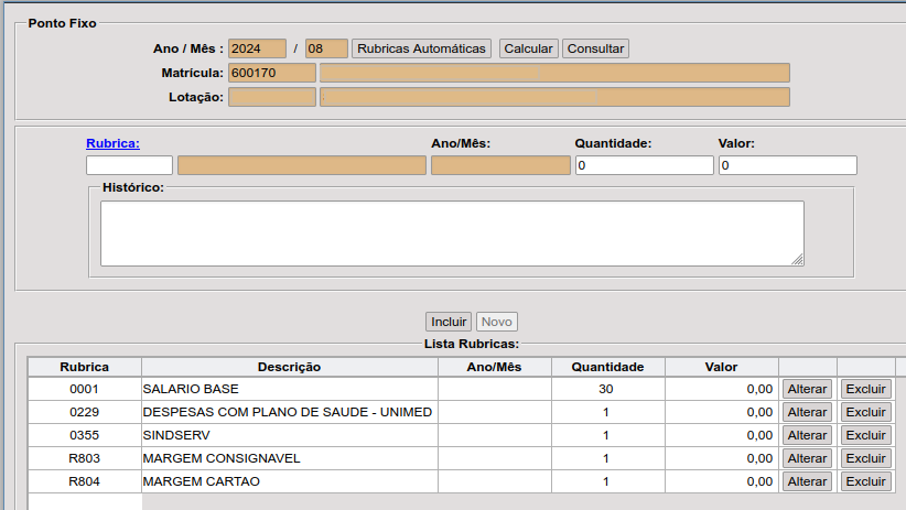 Destinado a inserção de rubricas configuradas com o tipo *“Fixa” , ou ainda **“Variável”, quando esta possuir a opção “Sim” na opção que trata de data limite, sendo que, esta será descartada no movimento imediatamente posterior ao “Ano/Mês” informado como final.