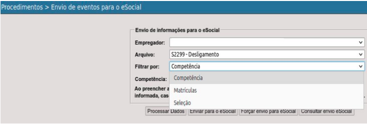 -Selecionar o evento: S-2299 Desligamento, que poderá ser enviado por Matrículas, Seleção ou por Competência (Ao preencher a competência, serão processados todos os servidores rescindidos na competência informada, caso contrario, serão processados todos o servidores rescindidos na competência atual).