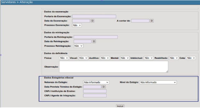 2o: Deverá ser feito os preenchimentos dos campos referente a dados do Estágio, na rotina de Cadastro de Servidores, Aba Dados Admissionais. Nesta tela estará disponível os dados obrigatórios para envio de dados para o eSocial.