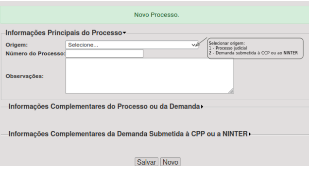 Ao acessar a rotina, clicar no botão “Novo” e realizar o preenchimento das informações principais do processo. Após o preenchimento, clicar no botão “Salvar”.