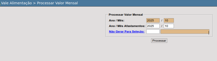 DB:RECURSOSHUMANOS > Pessoal > Procedimentos > Geração de Arquivos > Vale Alimentação > Processar Valor Mensal |
