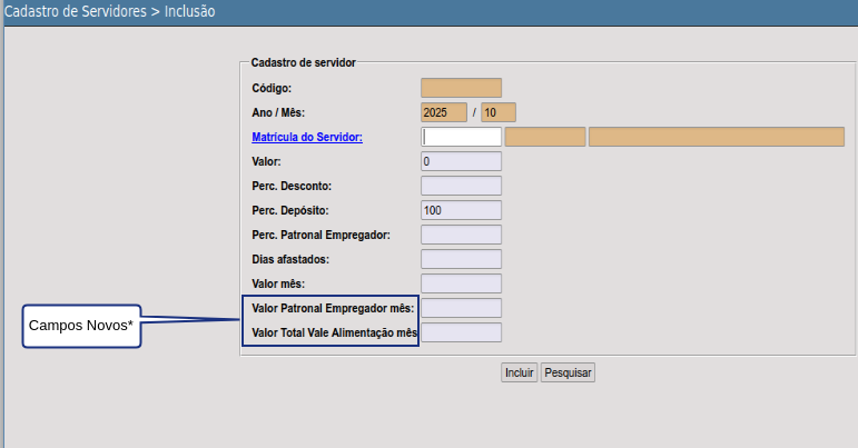 Valor Patronal Empregador mês:(*Campo Novo*): Informação automática do sistema através do cálculo (Valor do Mês/Dias Úteis) * (Dias Úteis-Dias Retornados pela Função*), mas que pode ser alterado pelo usuário, caso o mesmo ache necessário.