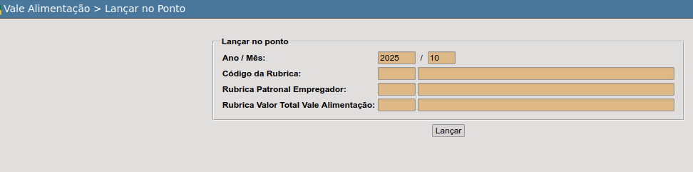 DB:RECURSOSHUMANOS > Pessoal > Procedimentos > Geração de Arquivos > Vale Alimentação > Lançar no Ponto |