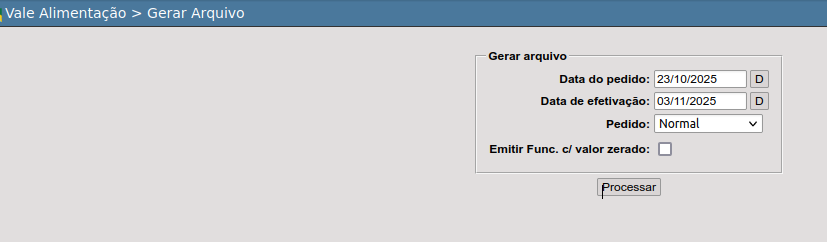 DB:RECURSOSHUMANOS > Pessoal > Procedimentos > Geração de Arquivos > Vale Alimentação > Gerar Arquivo |