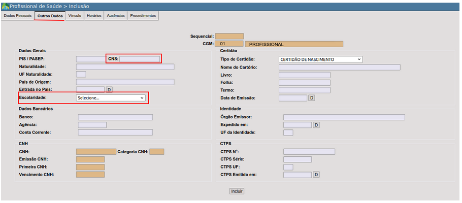- Escolaridade: Este campo é destinado ao informe da formação acadêmica do profissional.