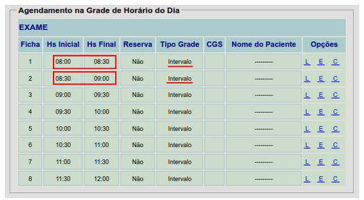 Exemplo: em atendimentos das 08:00 às 12:00, todas as fichas da agenda na grade são exibidas com horário das 08:00 e o horário final ficará em branco.