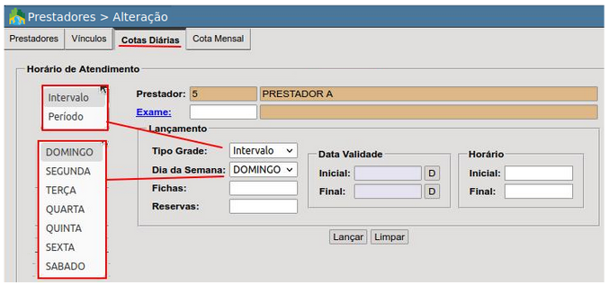 - Intervalo: horários com intervalo de tempo. Calculado automaticamente pelo sistema conforme o horário definido para início e fim dos agendamentos, dividido pelo número de fichas (fichas + reservas) determinadas para aquele dia.