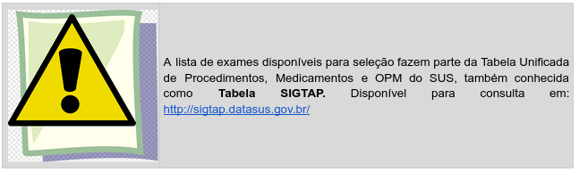 Exame: informar o exame que será realizado o controle. Só serão exibidos na lista de exames, os que foram previamente cadastrados para o referido prestador na aba Vínculo dessa rotina.