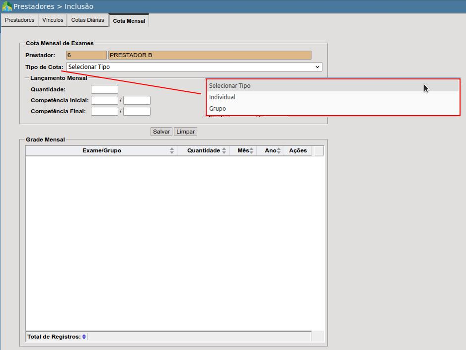 Controle Mensal: Este tipo de agenda atende prestadores que não possuem horários fixos para a realização dos exames, com horários que mudam mensalmente e controle baseado na quantidade fixa de exames disponíveis. O controle pode ser feito de forma individual (por exame) ou em grupo (conjunto de exames). Resumidamente, essa agenda é caracterizada pela flexibilidade no agendamento.