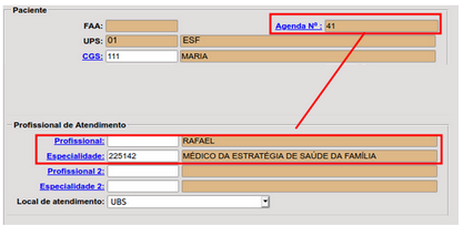 Se vincular o paciente pela agenda, o profissional e a especialidade já são exibidos nos respectivos campos para o Profissional do Atendimento. Caso o vínculo do paciente seja pelo CGS, os campos aparecerão em branco disponíveis para preenchimento.
