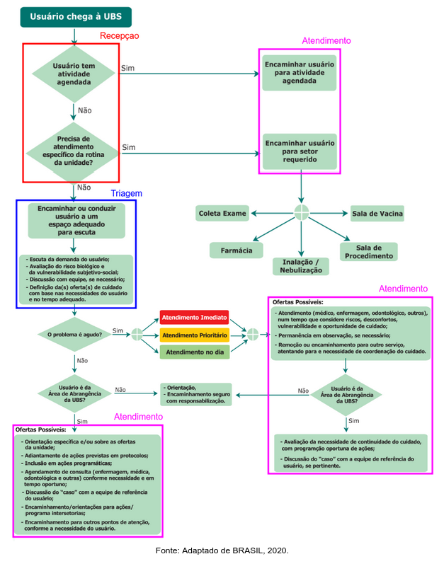 Os atendimentos realizados nas Unidades Básicas de Saúde geralmente seguem um fluxo padrão, como exemplificado no fluxograma abaixo. É importante ressaltar que nem todos os clientes seguem essa ordem ou têm acesso aos locais representados na figura. No entanto, a finalidade desta exposição é orientar como as ações de atendimento nas unidades básicas de saúde são integradas aos menus do e-Cidade.